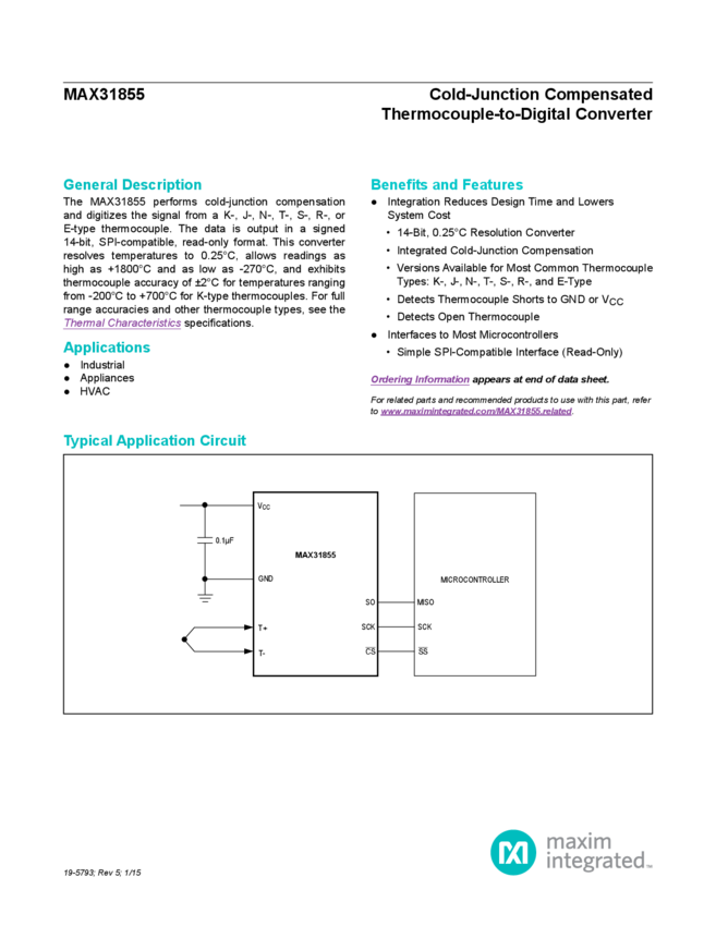 MAX31855 Cold-Junction Compensated Thermocouple-to-Digital Converter