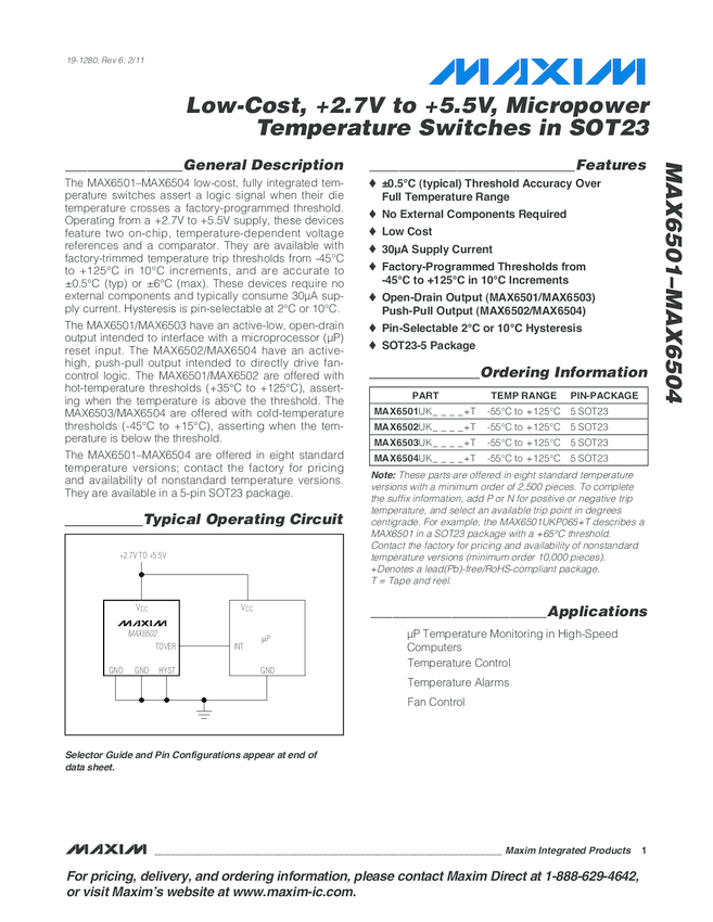 MAX6504 Low-Cost, 2.7V to 5.5V, Micropower Push/Pull SOT Temperature Switch with Cold Trip Threshold