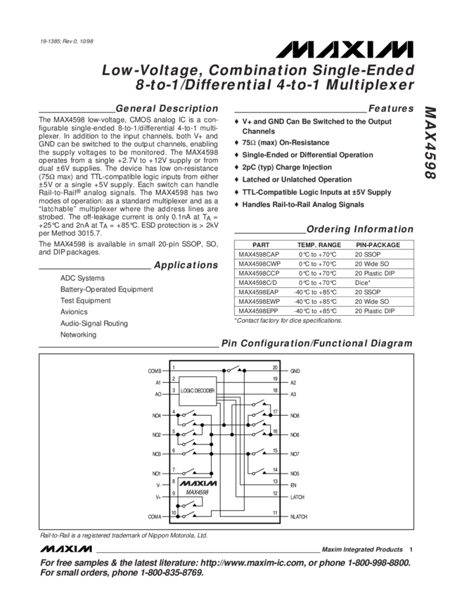 MAX4598 Low-Voltage, Combination Single-Ended 8-to-1/Differential 4-to-1 Multiplexer