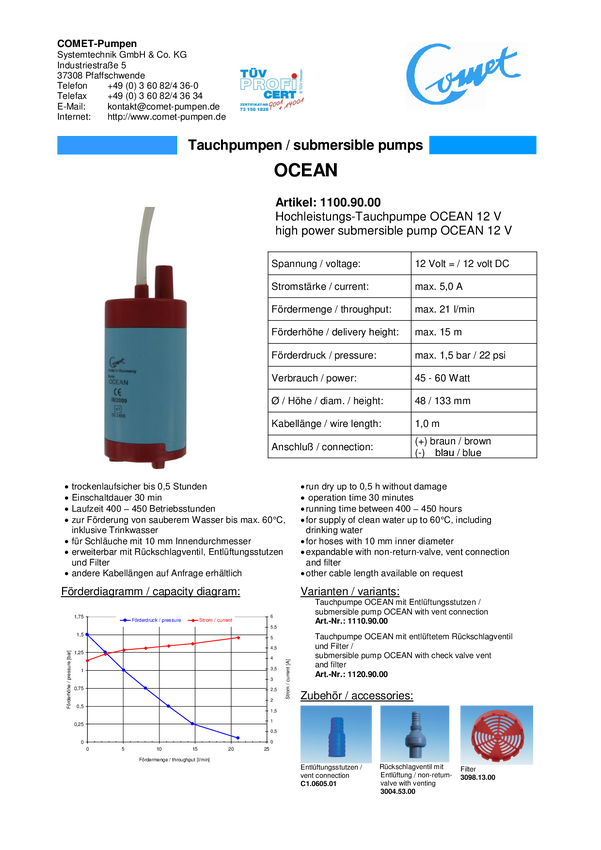 Pompa zanurzeniowa, niskonapięciowa Comet Ocean 12V 1100.90.59, 1.5 bar, 1260 l/h, 15 m