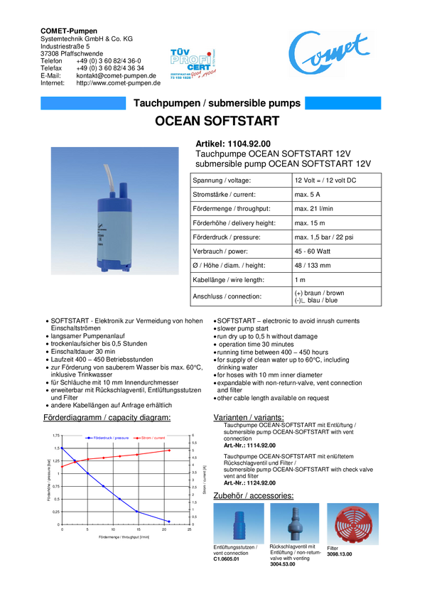 Pompa zanurzeniowa, niskonapięciowa Comet 1104.92.59, 1.5 bar, 1260 l/h, 15 m