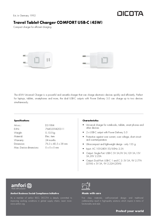 Zasilacz do laptopa Dicota Travel Tablet Charger COMFORT USB-C 45W 25 W, 20 W 3 A