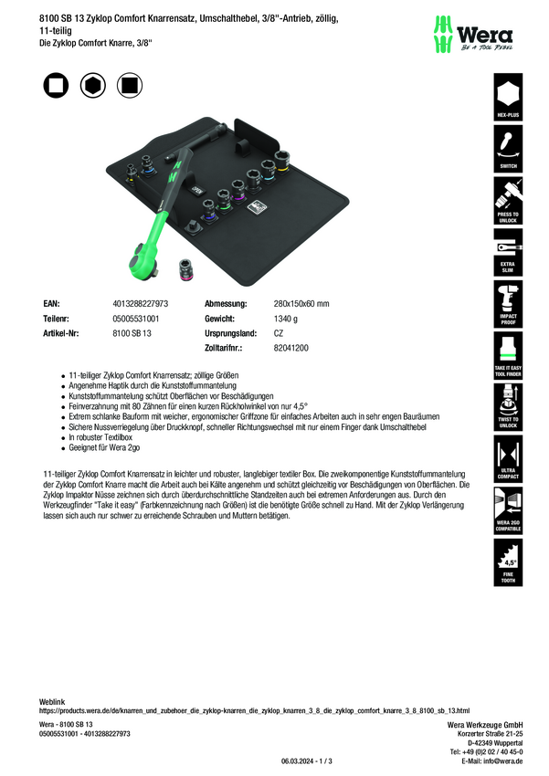 Grzechotka zapadkowa zestaw Wera 8100 SB 13 Zyklop Comfort 05005531001 3/8"
