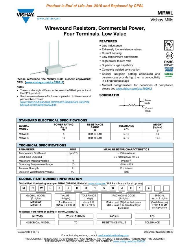 Wirewound Resistors, Commercial Power, Four Terminals, Low Value