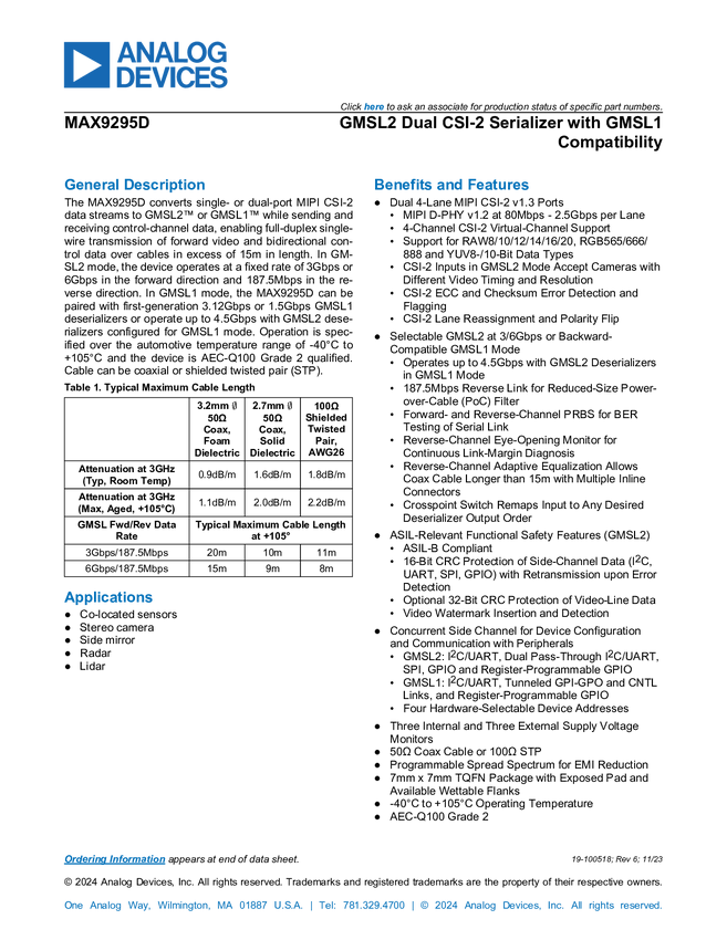 GMSL2 Dual CSI-2 Serializer with GMSL1 Compatibility