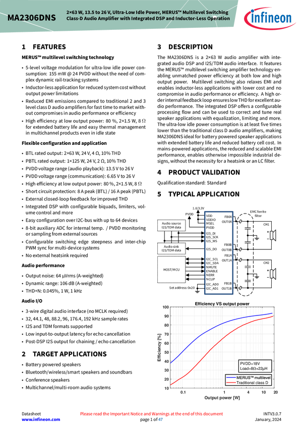 2x63 W, 13.5-26 V, ultra-low idle power, inductor-less operation, integrated DSP The MA2306DNS is a 2x63 W audio amplifier with I2S/TDM audio interface. It features the MERUS™ multilevel switching amplifier technology. Multilevel switching relaxes EMI and enables inductor‑less applications with lower cost and no compromise in audio performance or efficiency, battery life and reduced battery cell cost. The integrated DSP in the MA2306DNS is highly configurable.