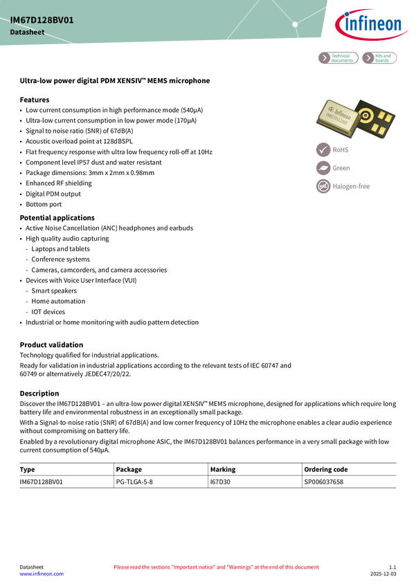 Ultra-low power digital PDM XENSIV™ MEMS microphone Discover the IM68D128B – an ultra-low power digital XENSIV™ MEMS microphone, designed for applications which require long battery life and environmental robustness in a small package. With a Signal-to-noise ratio (SNR) of 67.5dB(A) and low corner frequency of 20Hz the microphone enables a clear audio experience without compromising on battery life. Enabled by a revolutionary digital microphone ASIC, the IM68D128B balances performance in a small package at