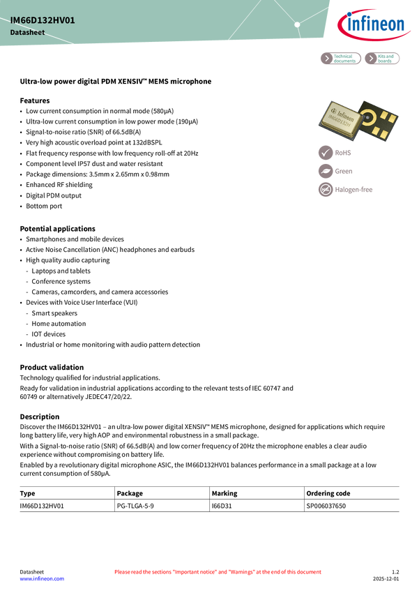 Ultra-low power digital PDM XENSIV™ MEMS microphone Discover the IM66D132H – an ultra-low power digital XENSIV™ MEMS microphone, designed for applications which require long battery life, high sensitivity and environmental robustness in a small package. With a Signal-to-noise ratio (SNR) of 66.5dB(A) and low corner frequency of 20Hz the microphone enables a clear audio experience without compromising on battery life. Enabled by a revolutionary digital microphone ASIC, the IM66D132H balances performance in