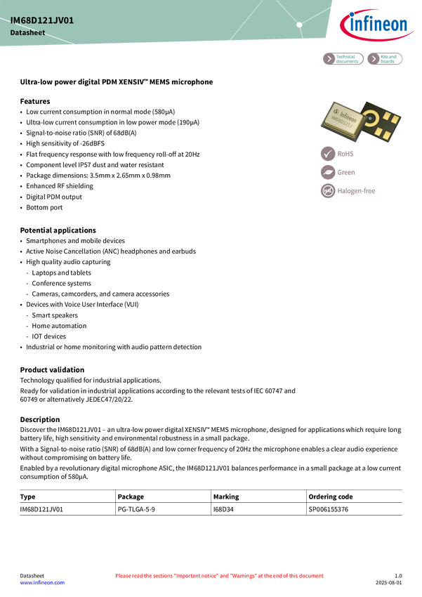 Ultra-low power digital PDM XENSIV™ MEMS microphone Discover the IM68D121J – an ultra-low power digital XENSIV™ MEMS microphone, designed for applications which require long battery life, very high AOP and environmental robustness in a small package. With a Signal-to-noise ratio (SNR) of 68dB(A) and low corner frequency of 20Hz the microphone enables a clear audio experience without compromising on battery life. Enabled by a revolutionary digital microphone ASIC, the IM68D121J balances performance in a sma