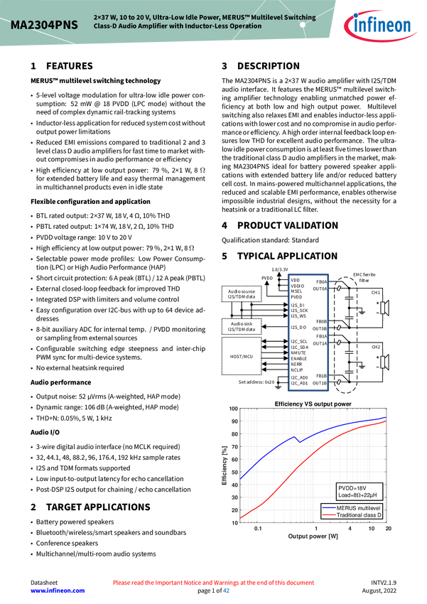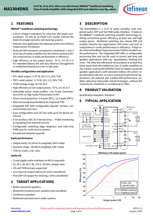 MERUS™ class-D audio amplifier, 2x37 W, 10-20 V, ultra-low idle power, inductor-less operation, integrated DSP The MA2304DNS is a 2x37 W audio amplifier with integrated audio DSP and I2S/TDM audio interface. It features the MERUS™ multilevel switching amplifier technology enabling unmatched power efficiency at both low and high output power. Multilevel switching also relaxes EMI and enables inductor‑less applications with lower cost and no compromise in audio performance or efficiency. An integrated DSP is