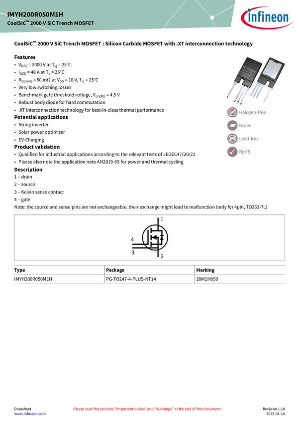 CoolSiC™ 2000 V SiC Trench MOSFET in TO-247PLUS-4-HCC package The CoolSiC™ 2000 V 50 mΩ SiC MOSFET in TO-247PLUS-4-HCC package has been designed to offer increased power density without compromising the system’s reliability even under demanding high voltage and switching frequency conditions. The low power losses of CoolSiC™ technology provide increased reliability thanks to the .XT interconnection technology in a 2000 V optimized package, enabling top efficiency in applications such as string inverters, s