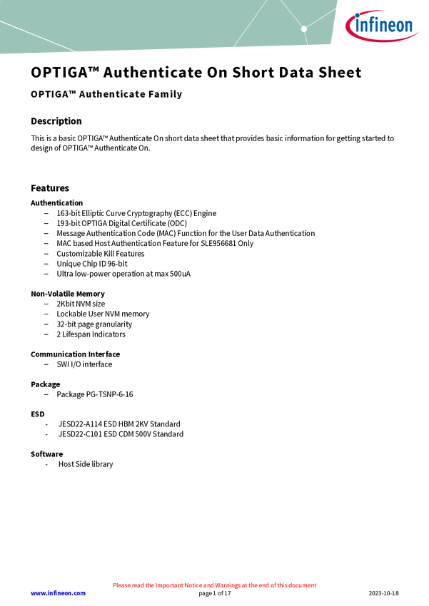 The ideal anti-counterfeiting solution for mobile device batteries OPTIGA™ Authenticate On is an authentication solution optimized for mobile device batteries, designed to be easily integrated into even the smallest phone or tablet batteries without compromising performance or reliability. It is a one-package bus-powered solution that reduces the bill of materials and simplifies implementation.