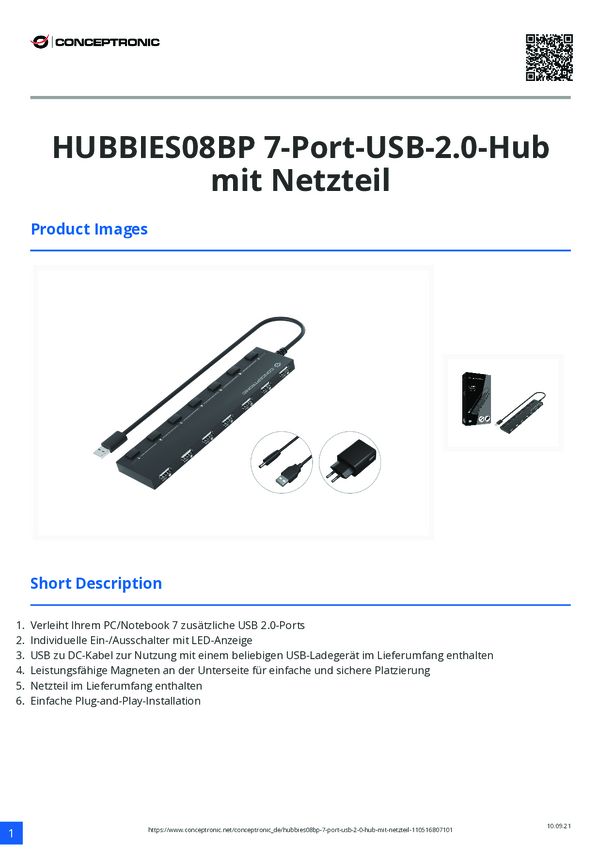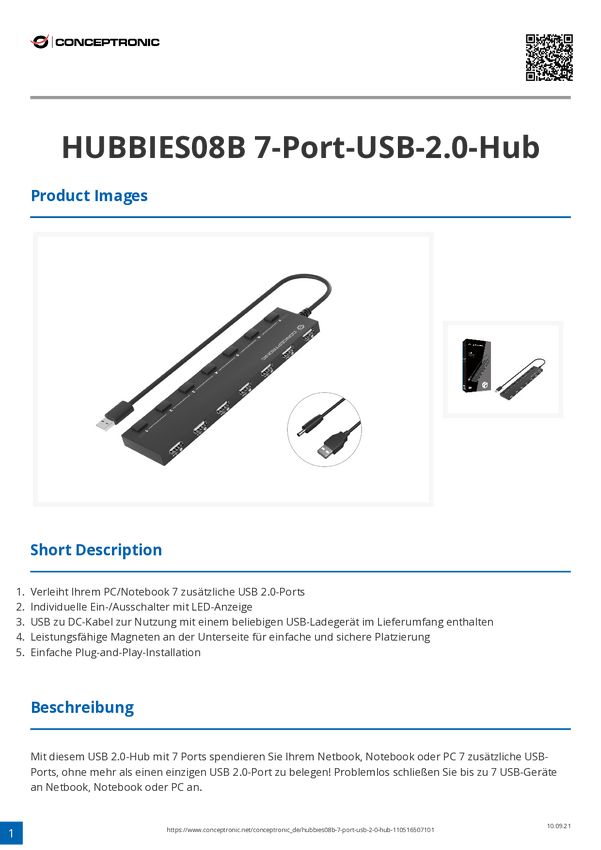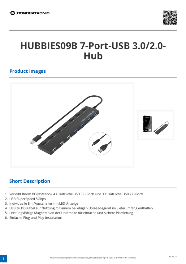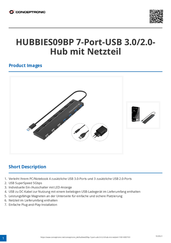 Conceptronic HUBBIES09BP USB-Hub 7 Portów USB-A USB 3.1 Gen1 5 GBit/s czarny HUBBIES09BP