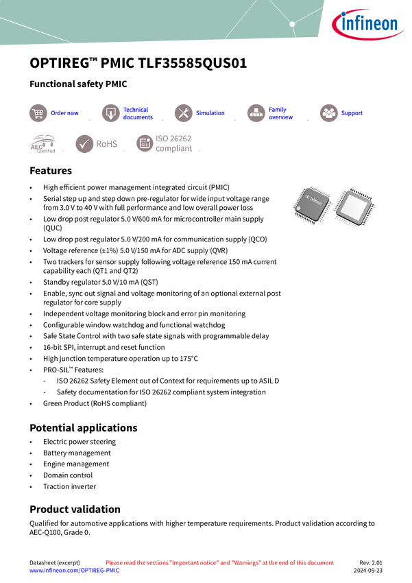 The TLF35585QUS01 PMIC is a multiple output Power Management IC for safety-relevant applications supplying 5V microcontroller, transceivers, and sensors by an efficient and flexible pre-/ post-regulator concept over a wide input voltage range. The wide switching frequency range allows optimization in respect of efficiency and usage of small filter components. A dedicated reference-regulator supplies the ADC independent from microcontroller load steps and acts as tracking-source for the two-independent sens