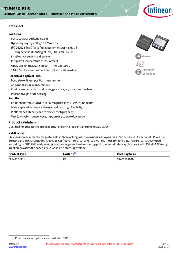 XENSIV™ - TLE493D-P3I8 concept makes the sensor versatile and suitable for a wide range of applications XENSIV™ TLE493D-P3I8 is a magnetic 3D sensor based on Hall technology. The sensor measures the magnetic field in three orthogonal dimensions and outputs the data through SPI interface. This concept makes the sensor versatile and suitable for a wide range of applications. With its built-in diagnostic functions and ISO 26262 compliance, TLE493D-P3I8 supports functional safety applications. Low power design
