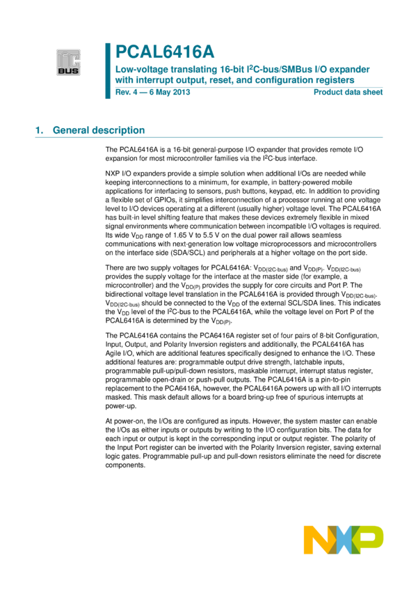 Low-voltage translating 16-bit I2C-bus/SMBus I/O expander with interrupt output, reset, and configuration registers