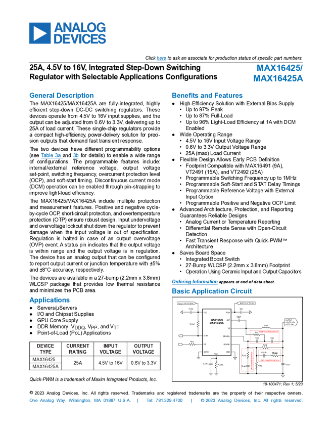 25A, 4.5V to 16V, Integrated, Step-Down Switching Regulator with Selectable Applications Configurations