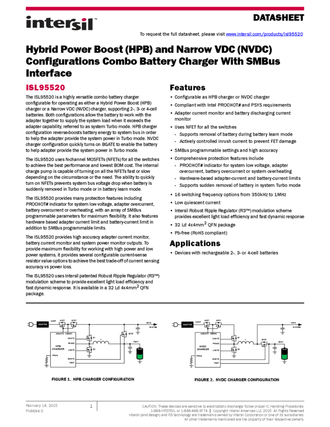Hybrid Power Boost (HPB) and Narrow VDC (NVDC) Configurations Combo Battery Charger With SMBus Interface