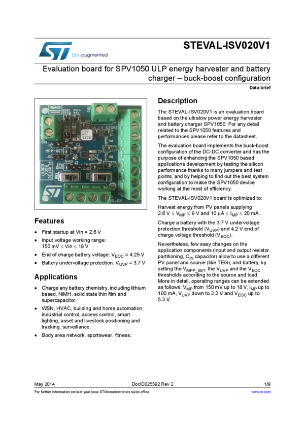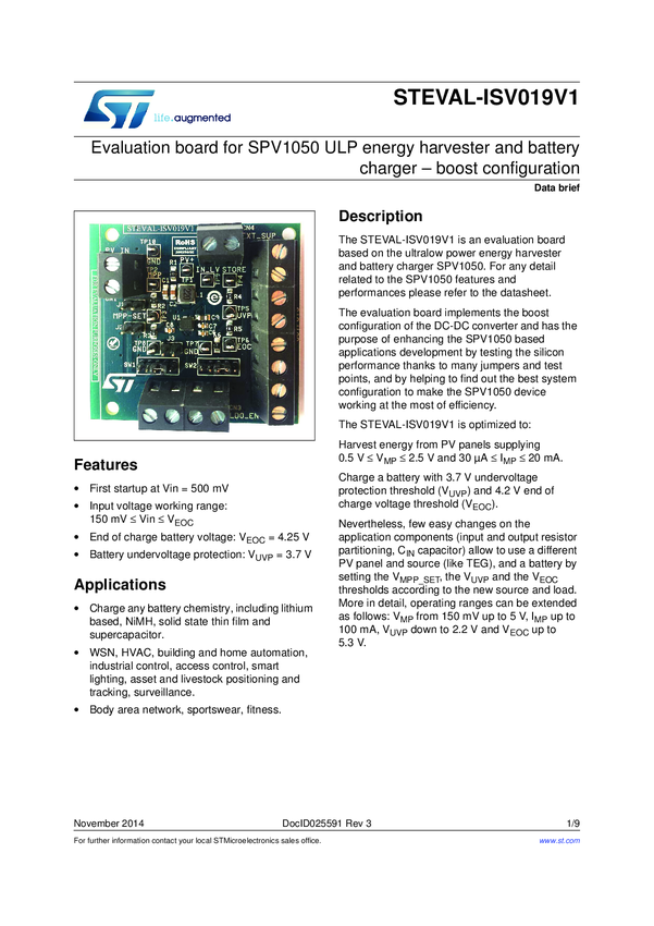 Evaluation board for SPV1050 ULP energy harvester and battery charger - boost configuration
