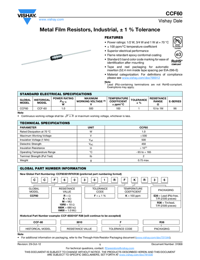 Res Metal Film 10K Ohm 1% 1W ±100ppm/°C Conformal AXL Thru-Hole T/R