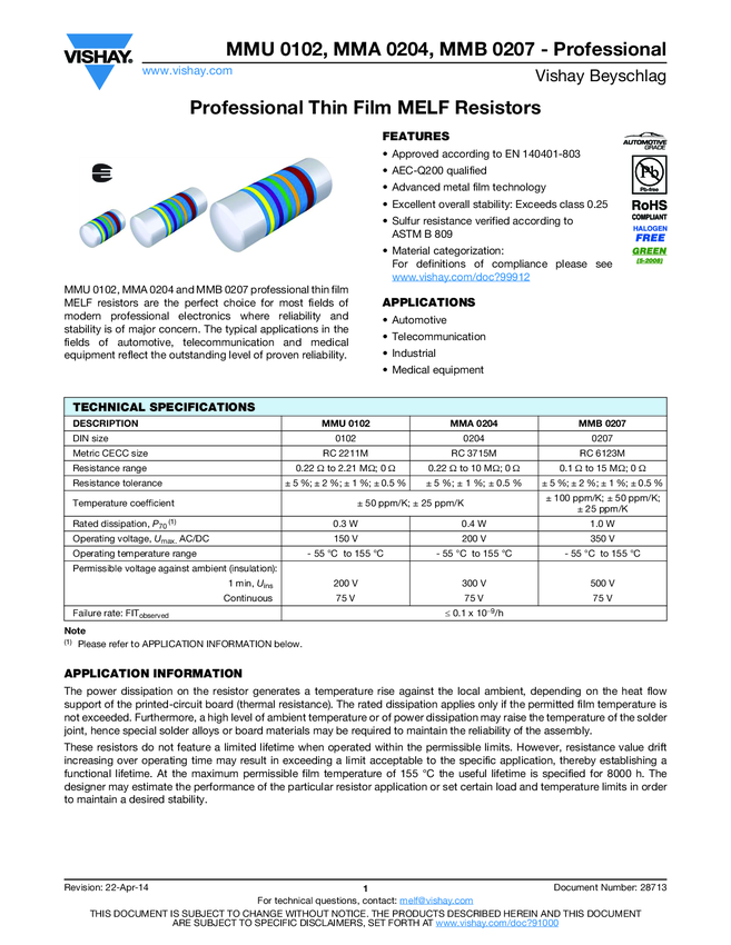 Res Thin Film 2309 22 Ohm 1% 1W ±50ppm/°C Conformal Melf SMD Blister T/R