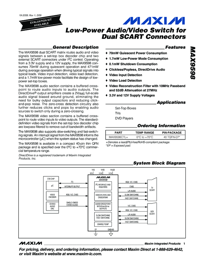 MAX9598 Low-Power Audio/Video Switch for Dual SCART Connectors