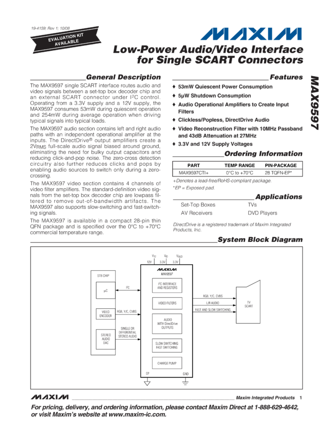 MAX9597 Low-Power Audio/Video Interface for Single SCART Connectors
