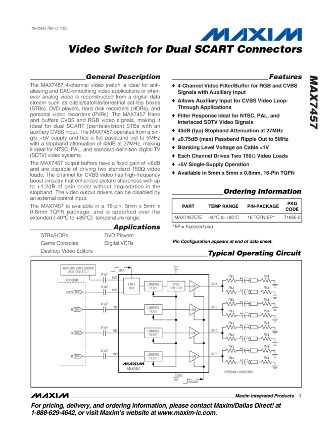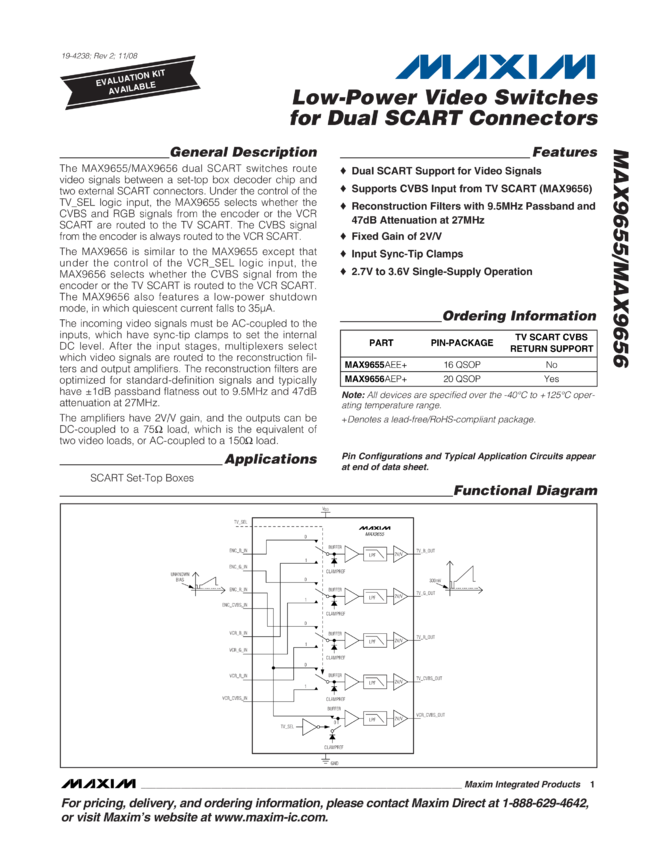 MAX9655, MAX9656 Low-Power Video Switches for Dual SCART Connectors