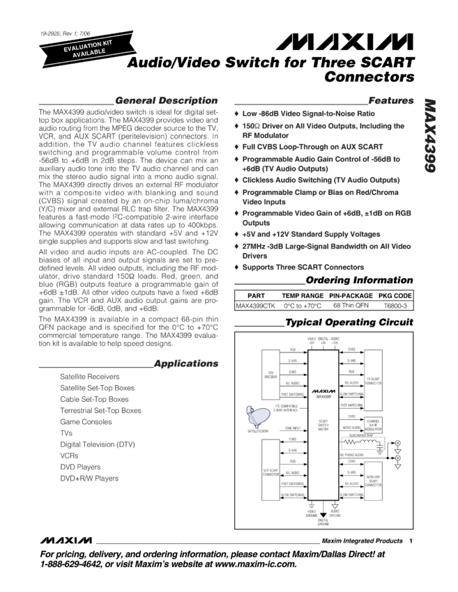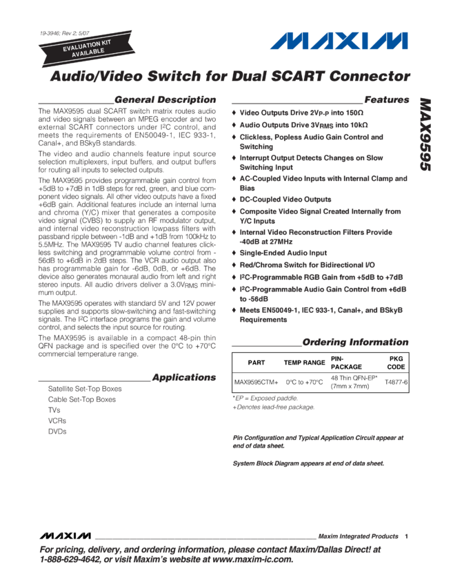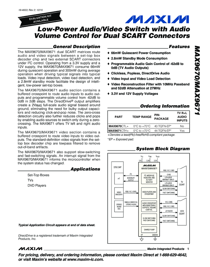 MAX9670, MAX9671 Low-Power Audio/Video Switches with Audio Volume Control for Dual SCART Connectors