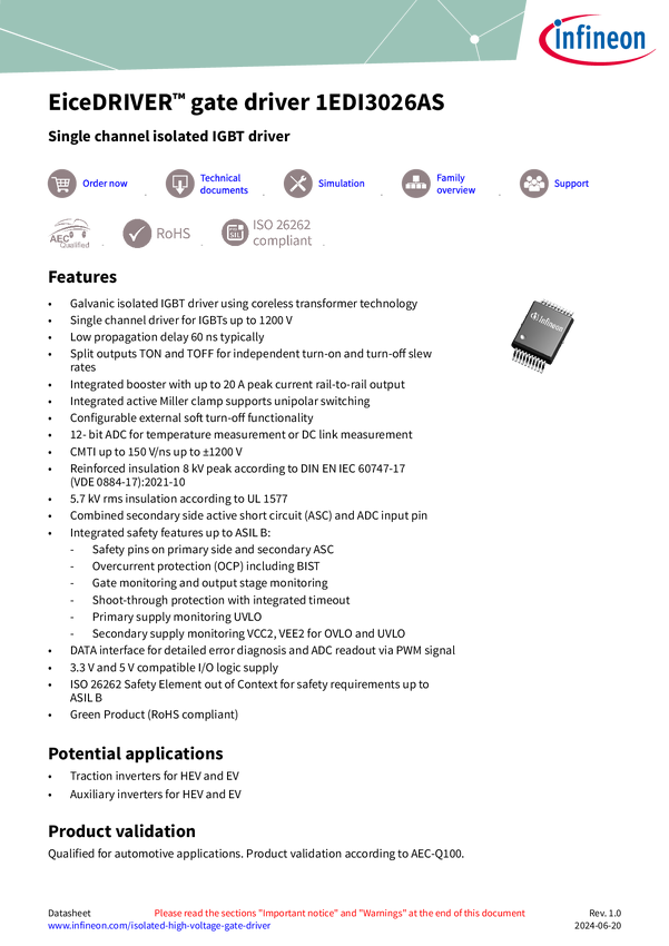 The EiceDRIVER™ 1EDI3026AS is an automotive qualified single-channel high-voltage gate driver optimized for IGBT technologies. The EiceDRIVER™ gate driver 1EDI3026AS is a high-voltage IGBT driver for automotive applications, offering 8 kV galvanic insulation with coreless transformer (CT) technology. It provides a powerful output stage with up to 20 A peak current for high power switches. It features a split output stage for different slew rates during switching on and off, achieved by separate gate resist