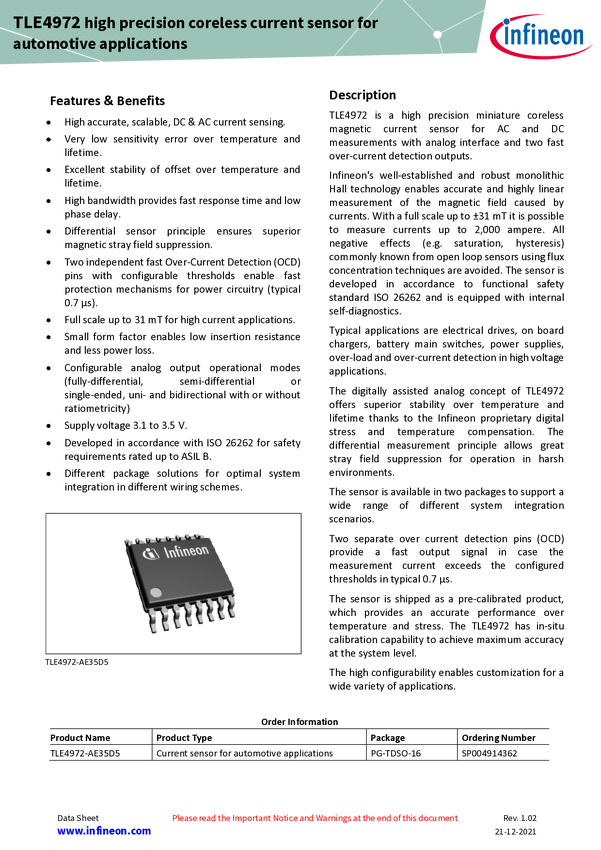 XENSIV™ - TLE4972-AE35D5 magnetic coreless current sensor in a leaded TDSO-16 package Analog high precision current sensor TLE4972 equipped with fast overcurrent detection pins. It's robust against stray fields, ideal for EMC-prone environments. The digitally assisted analog concept ensures stability over temperature and lifetime. AEC-Q100 and ISO 26262 qualified for safety up to ASIL B, suitable for traction inverter, battery main switch. Packaged in PG-TDSO-16, usable in 48 V & high voltage apps with
