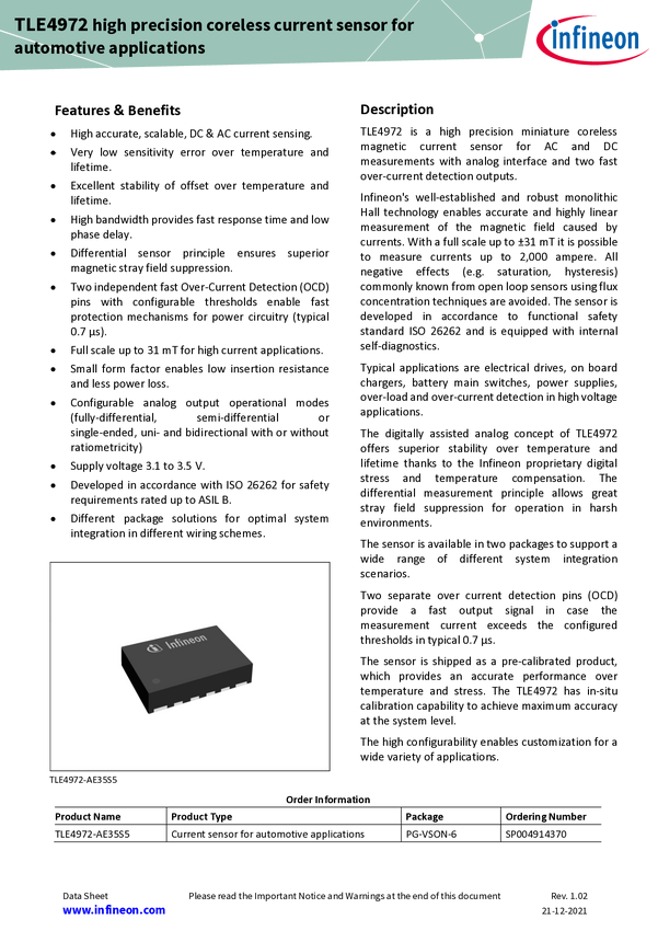 XENSIV™ - TLE4972-AE35S5 magnetic coreless current sensor in a leadless VSON-6 package Robust, high precision current sensor TLE4972 –AE35S5 using Hall technology, ideal for EMC prone environments. Its proprietary compensation and digital measurement ensure high stability over temperature and lifetime. With accurate measurement up to 31 mT, it avoids saturation & hysteresis. VSON-6 package enables low power losses. Includes overcurrent pins for fast detection in safety critical applications, ISO 26262-