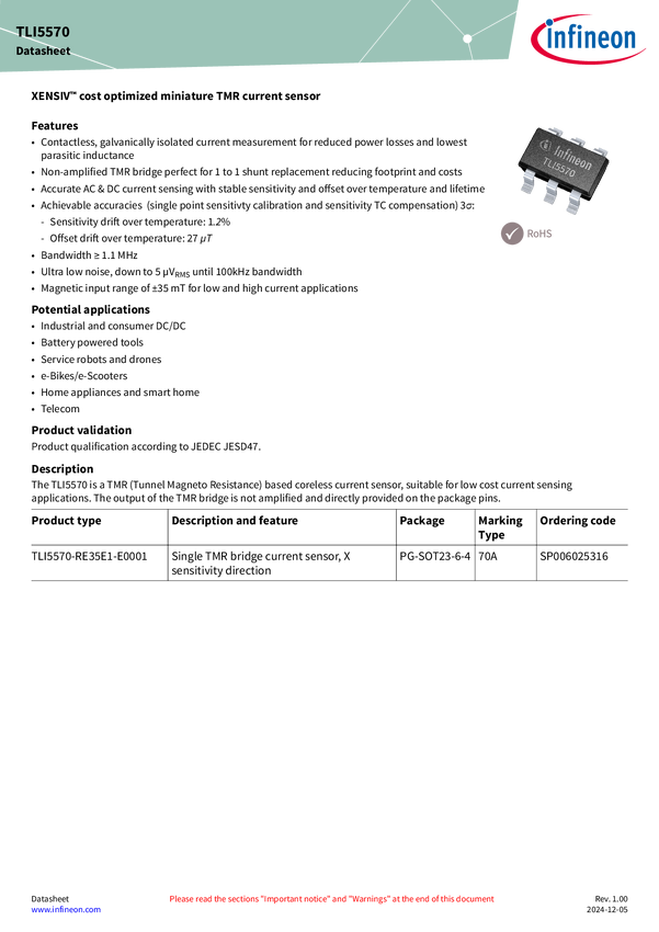 XENSIV™ - TLI5570-AE35E1-E0001 high precision coreless current sensor with differential analog interface in miniaturized package The XENSIV™ TLI5570-AE35E1-E000 is a high-precision miniature coreless magnetic sensor for AC and DC measurement. Our revolutionary and robust, highly linear monolithic TMR (tunnel magneto resistance) technology enables accurate current measurement. With a bandwidth of a more than 1.1 MHz, this sensor provides a non-amplified high-speed differential analog output signal to be dir