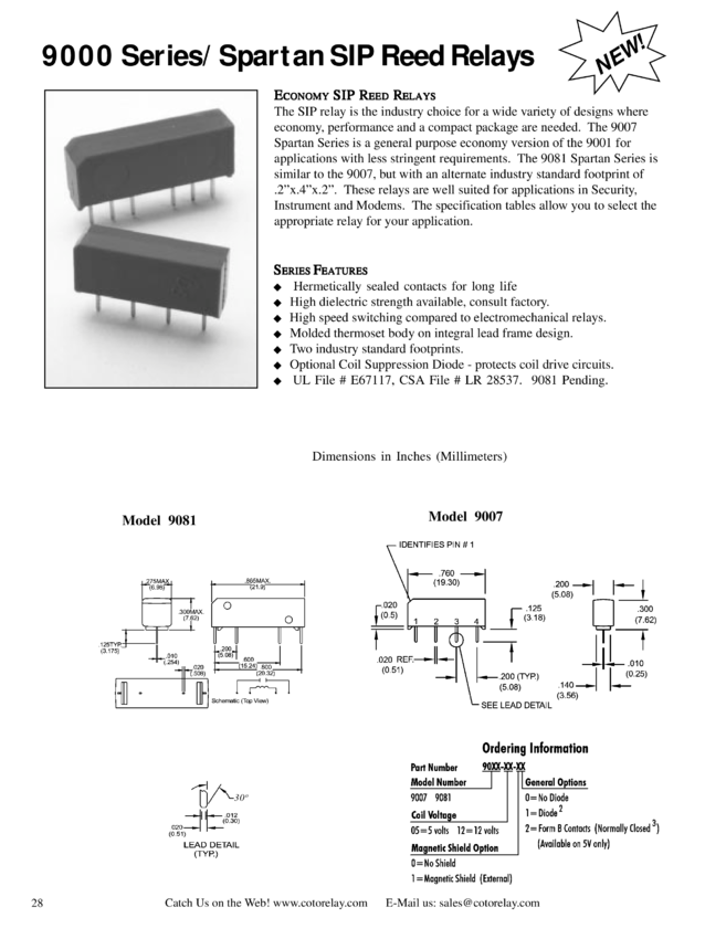 Miniaturowy, przekaźnik kontaktronowy, , ze stykiem zwiernym, prąd przełączany 0.25A, napięcie przełaczane 100V, napięcie cewki , rezystancja cewki 150Ω, COTO