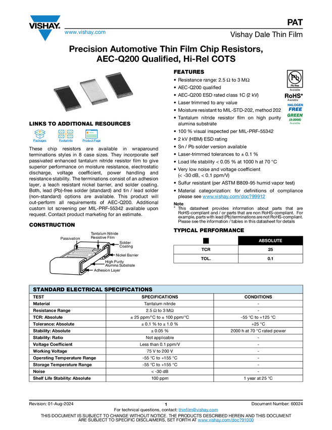 Precision Automotive Thin Film Chip Resistors, AEC-Q200 Qualified, Hi-Rel COTS