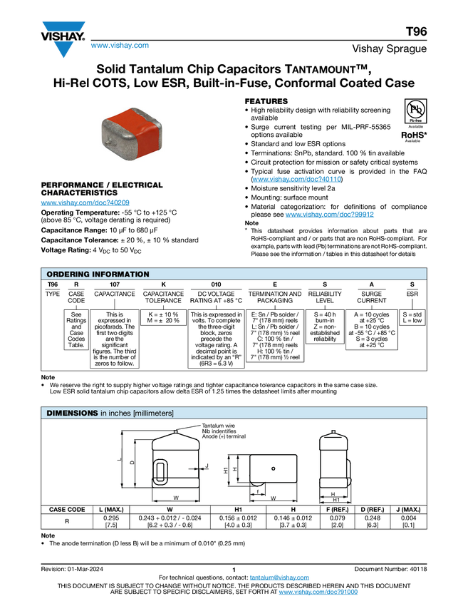 Solid Tantalum Chip Capacitors TANTAMOUNT™, Hi-Rel COTS, Low ESR, Built-in-Fuse, Conformal Coated Case