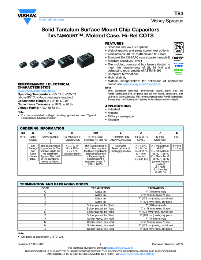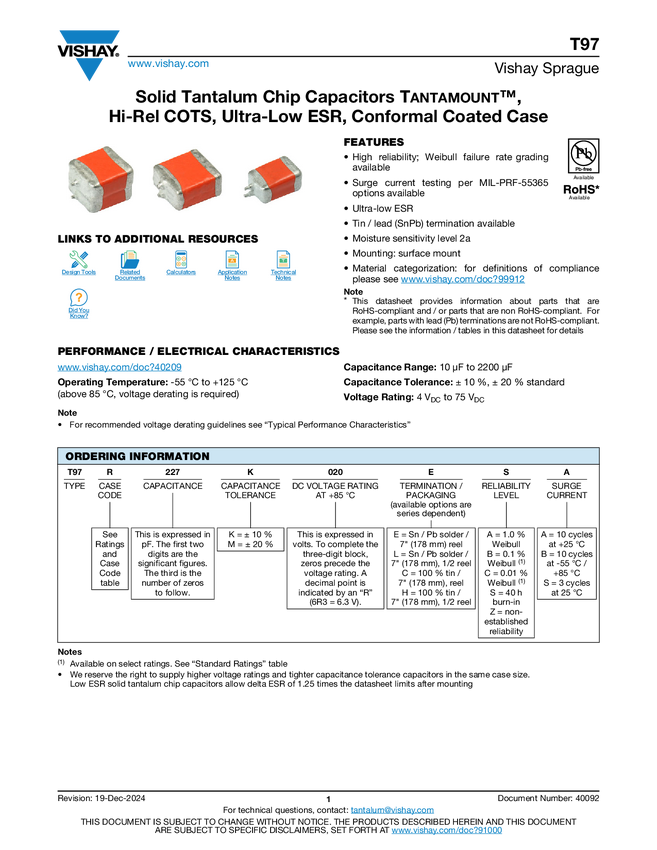Solid Tantalum Chip Capacitors, TANTAMOUNT™, High-Rel COTS, Conformal Coated
