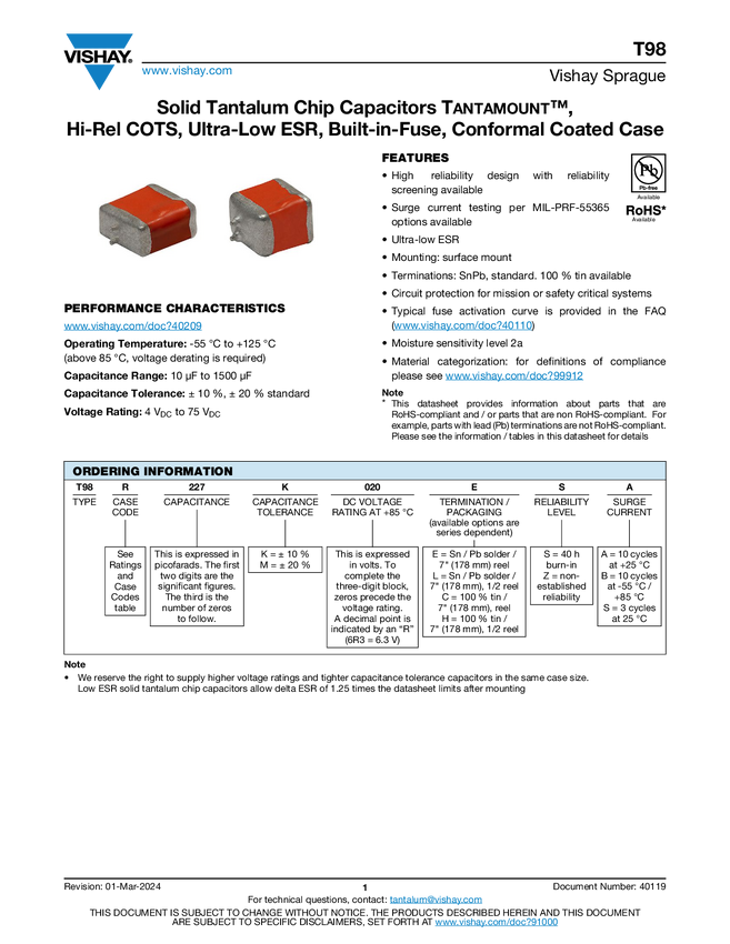 Solid Tantalum Chip Capacitors TANTAMOUNT™, Hi-Rel COTS, Ultra-Low ESR, Built-in-Fuse, Conformal Coated Case
