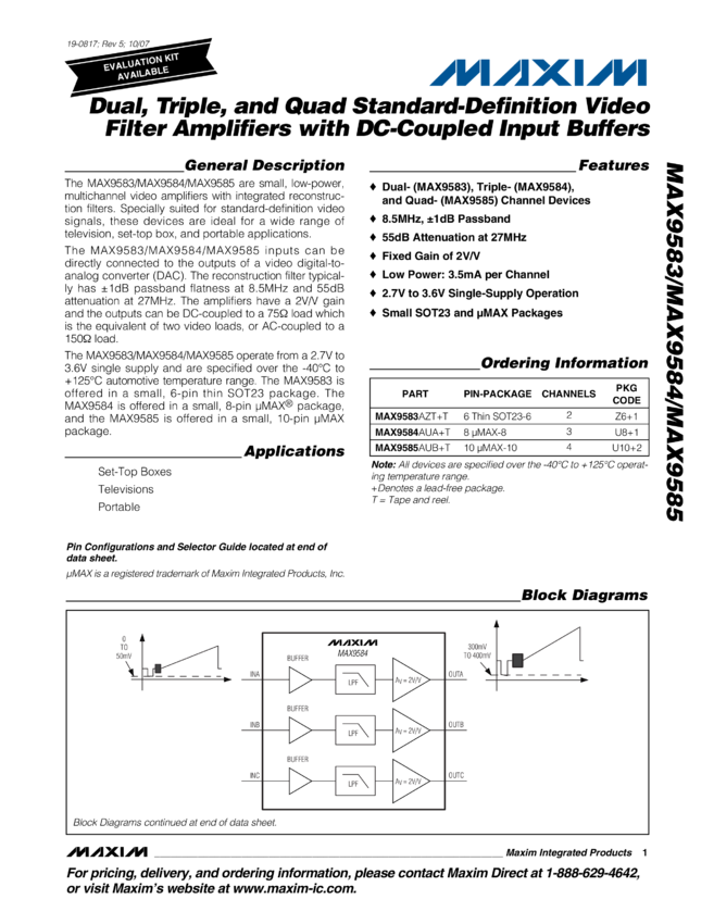MAX9583, MAX9584, MAX9585 Dual, Triple, and Quad Standard-Definition Video Filter Amplifiers with DC-Coupled Input Buffers