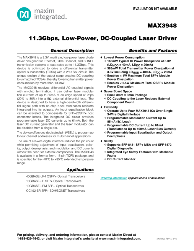 MAX3948 11.3Gbps, Low-Power, DC-Coupled Laser Driver