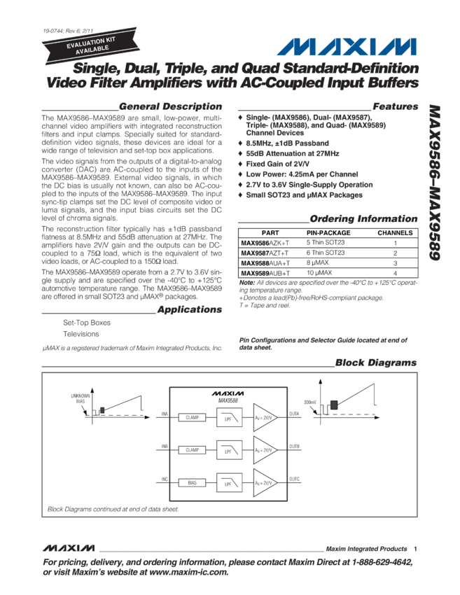 MAX9586, MAX9587, MAX9588, MAX9589 Single, Dual, Triple, and Quad Standard-Definition Video Filter Amplifiers with AC-Coupled Input Buffers