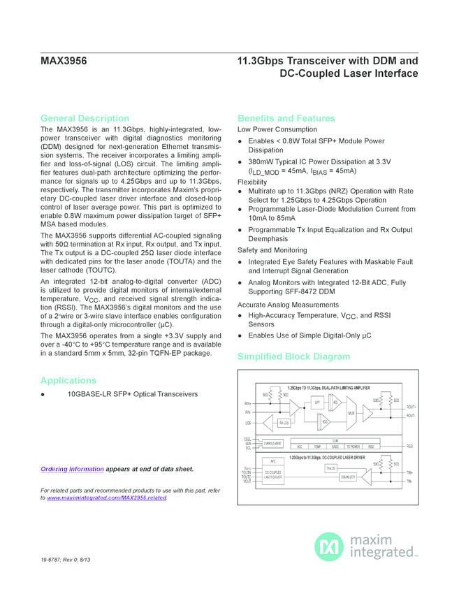 MAX3955 11.32Gbps Transceiver with Dual CDRs, Digital Monitors and DC-Coupled Laser Driver