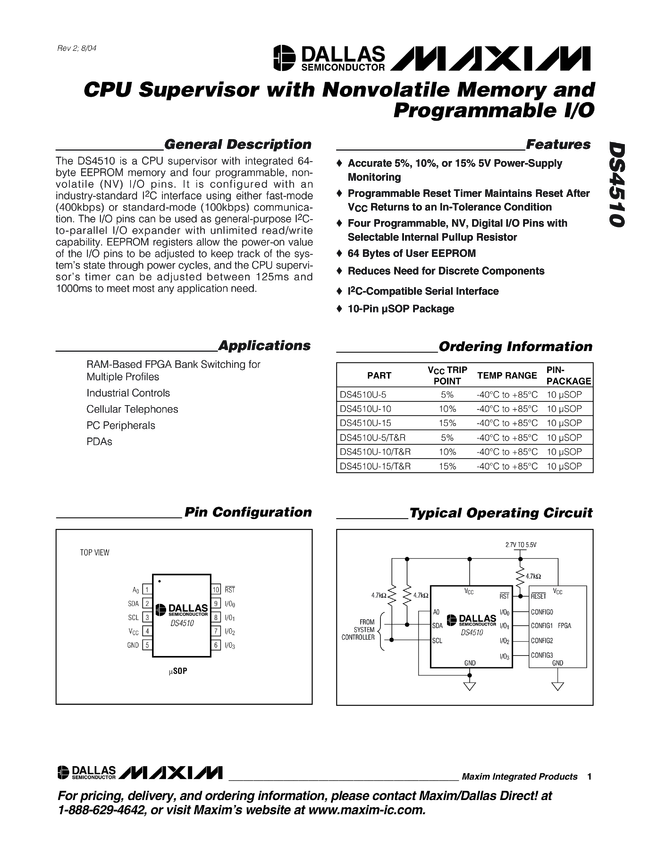 DS4510 CPU Supervisor with Nonvolatile Memory and Programmable I/O
