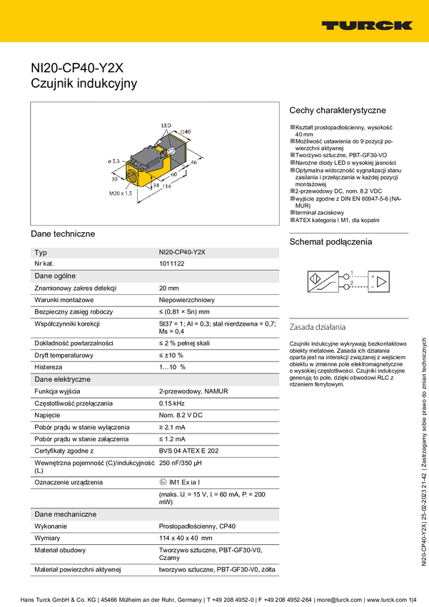 Turck Czujnik indukcyjny nie podtynkowy NAMUR NI20-CP40-Y2X