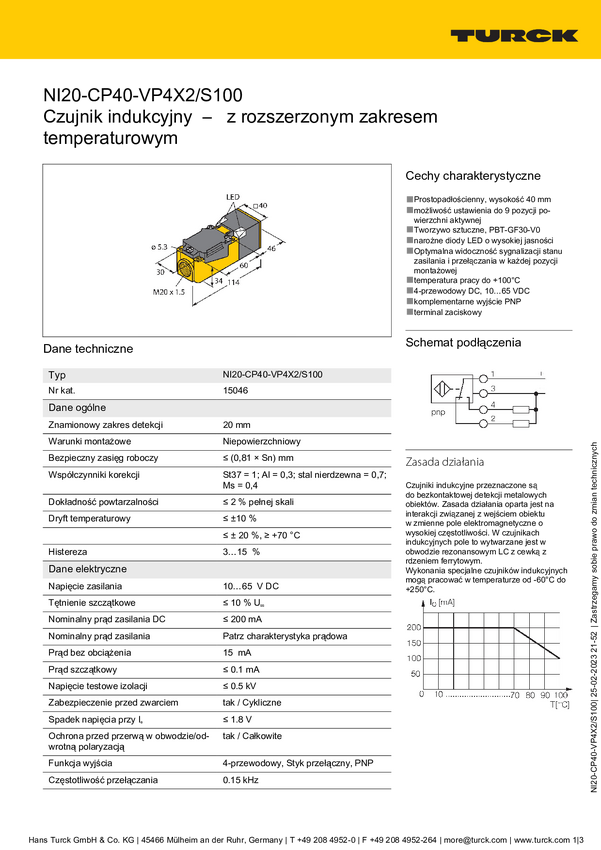 Turck Czujnik indukcyjny nie podtynkowy PNP, Przełącznik NI20-CP40-VP4X2/S97