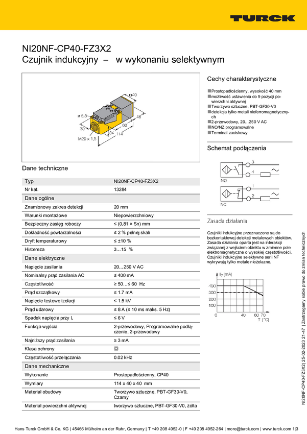 Turck Czujnik indukcyjny nie podtynkowy NI20NF-CP40-FZ3X2