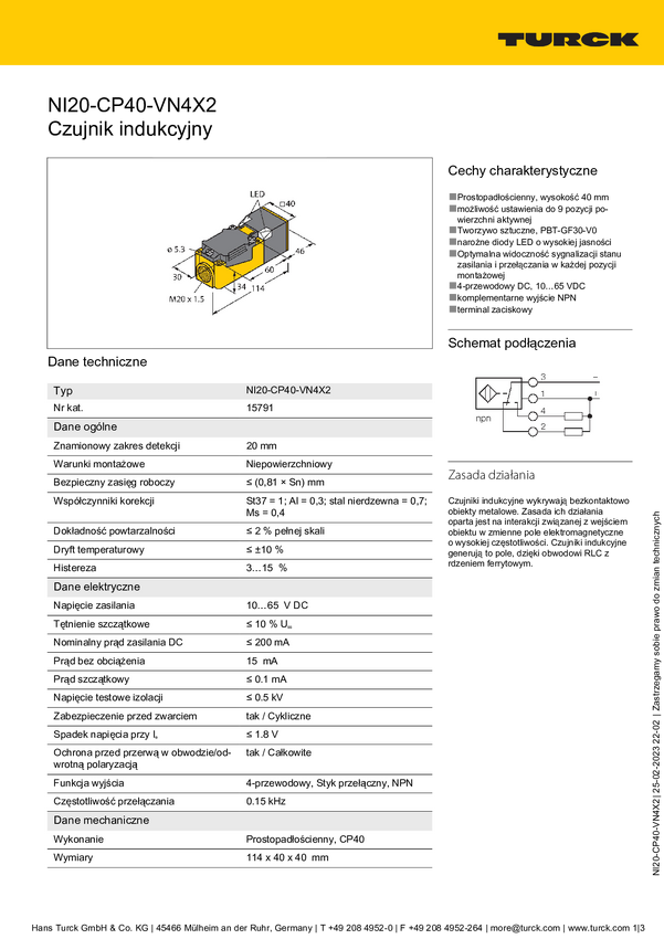 Turck Czujnik indukcyjny nie podtynkowy PNP, Przełącznik NI20NF-CP40-VP4X2