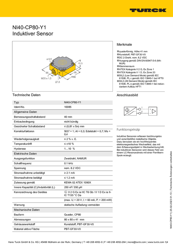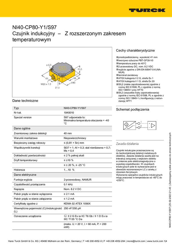 Turck Czujnik indukcyjny nie podtynkowy NAMUR NI40-CP80-Y1