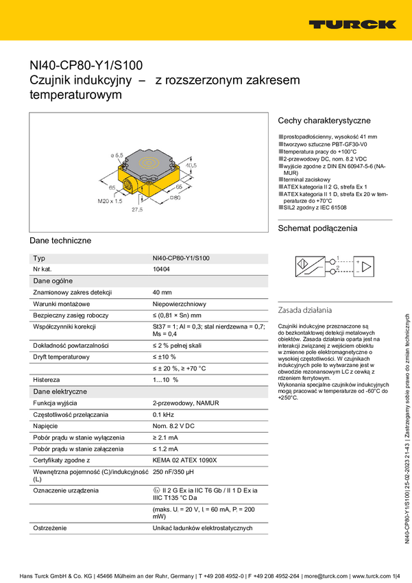 Turck Czujnik indukcyjny nie podtynkowy NAMUR NI40-CP80-Y1/S100
