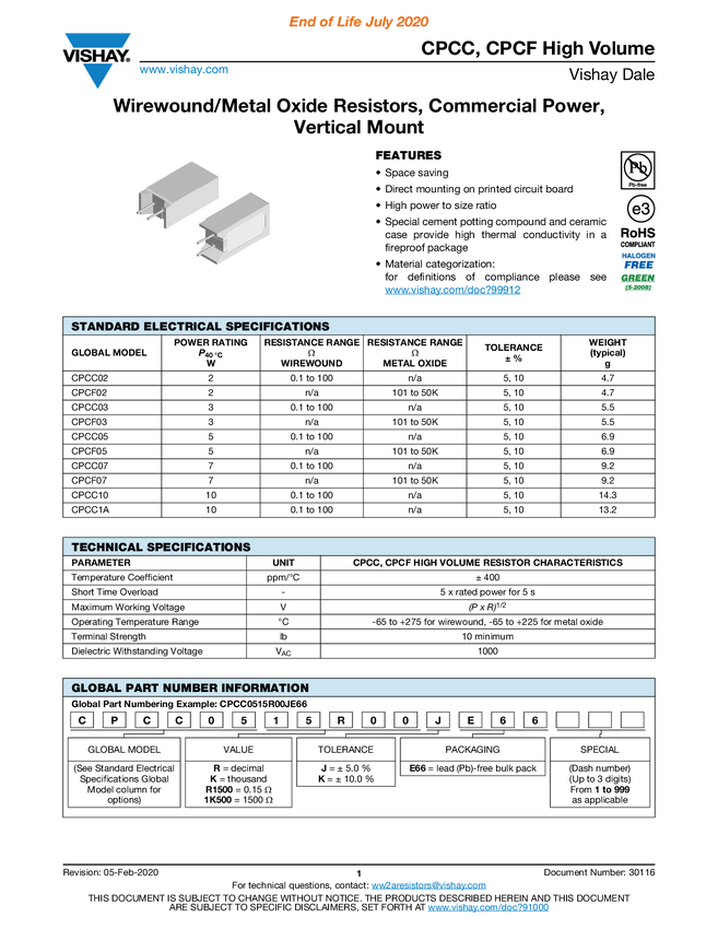Wirewound/Metal Oxide Resistors, Commercial Power, Vertical Mount